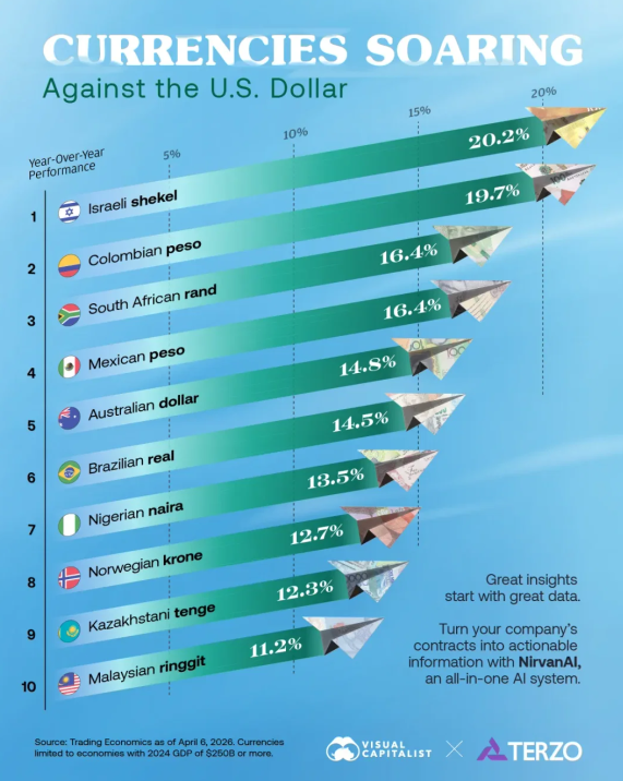 На тлі глобальних макроекономічних зрушень низка національних валют продемонструвала вражаюче зростання по відношенню до долара США. Згідно з даними порталу Trading Economics станом на 6 квітня 2026 року, які були проаналізовані платформою Visual Capitalist, абсолютним лідером рейтингу став ізраїльський шекель.