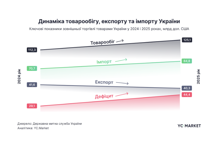 У результаті торговельний дефіцит розширився до $44,4 млрд. Це головний підсумок періоду: зовнішня торгівля України збільшилася за обсягом, але стала ще більш імпортозалежною.