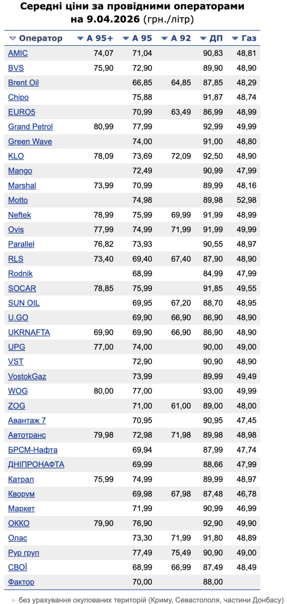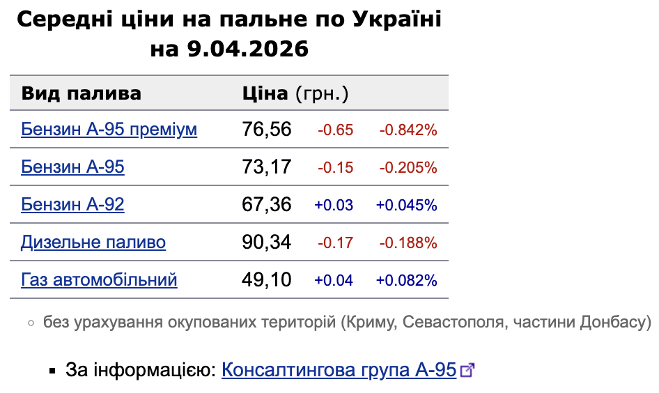 Після тривалого періоду зростання, спричиненого геополітичною напруженістю навколо Ормузької протоки, український паливний ринок нарешті відреагував на новини про тимчасове перемир’я. Станом на 9 квітня на заправках зафіксовано перше відчутне зниження вартості основних видів пального. При цьому автогаз та А-92 дещо додали у ціні. Про це повідомляє «Мінфін» із посиланням на дані Консалтингової групи «А-95».