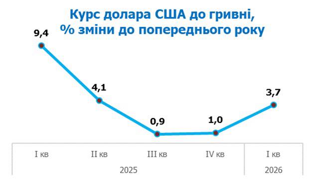 Вагомим інструментом стримування імпортної інфляції залишається ручне управління девальвацією гривні через валютні інтервенції НБУ. Однак, після вимог МВФ щодо посилення «гнучкості» валютного курсу, використання даного інструмента для стримування інфляції буде обмеженим. Середній темп девальвації гривні на 2026 рік прогнозується +5−7%, що прискорюватиме імпортну інфляцію.