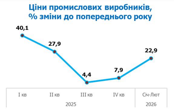 Інфляція знаходиться під домінантним тиском зростання цін промислових виробників (+23% в середньому за 2 місяці 2026 р. проти минулого року, переважно за рахунок росту цін на енергоносії: +39%). Інші фактори прискорення інфляції — підвищення акцизів на тютюн та пальне, ріст світових цін (зокрема на олію та енергоносії), фіскальний дефіцит, а також погодні умови