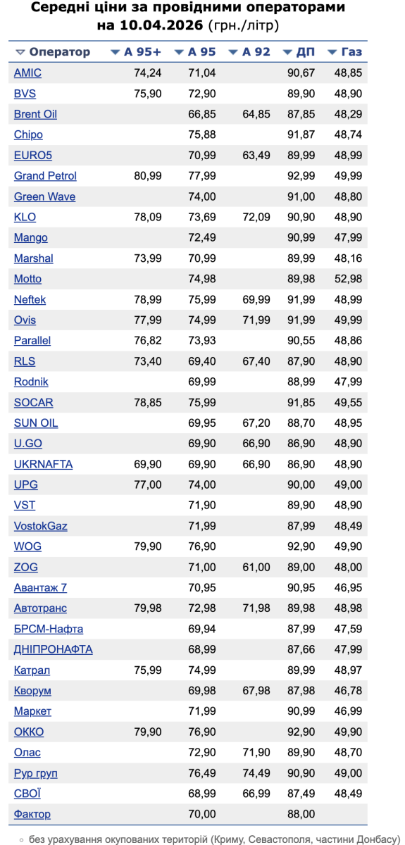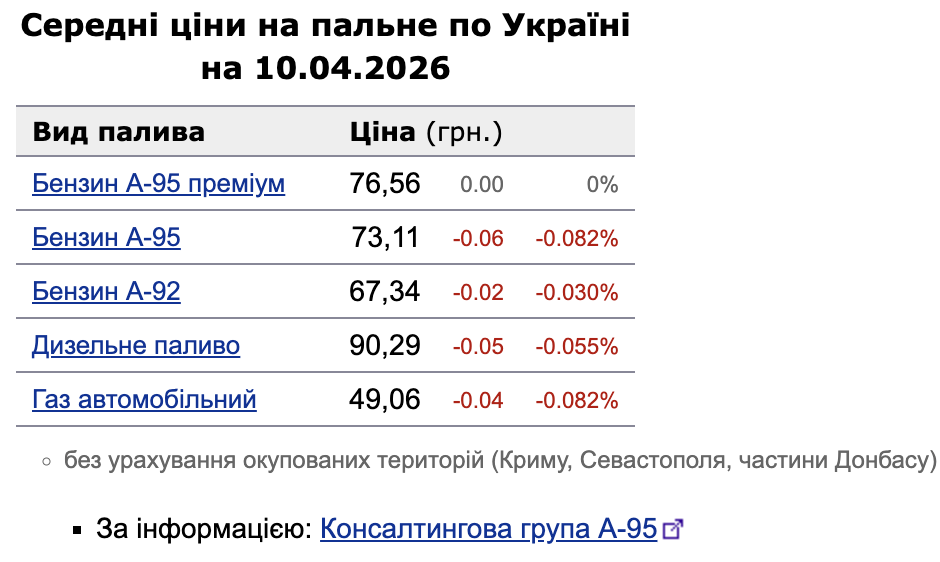 Станом на п’ятницю, 10 квітня, ціни на українських автозаправних станціях демонструють незначне зниження. Більшість видів пального за добу втратили у вартості кілька копійок. Про це повідомляє «Мінфін» із посиланням на дані Консалтингової групи «А-95».