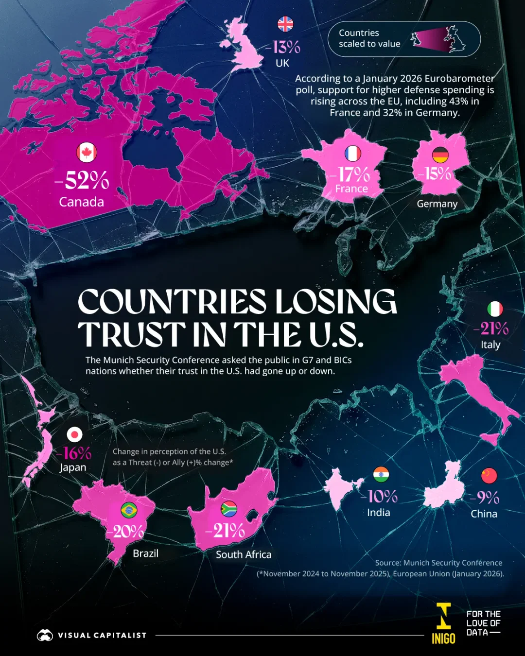 Аналіз даних за період з листопада 2024 до листопада 2025 року, демонструє тотальне зниження довіри до політики США у всіх досліджуваних країнах. Найрадикальніший обвал настроїв зафіксовано в Канаді — показник сприйняття південного сусіда як надійного союзника впав одразу на 52%.