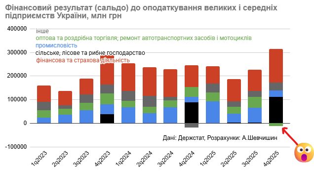 Фінансові аномалії 4 кварталу 2025 року: торгівля зазнала збитків, фінкомпанії отримали рекордний прибуток