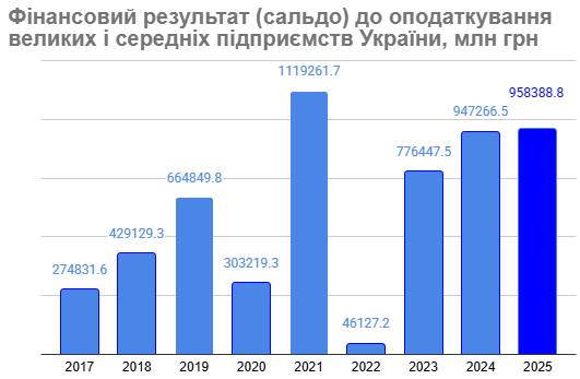 Фінансовий результат великих та середніх підприємств до оподаткування у 2025 року зріс всього на 1,2% до 958,4 млрд грн.