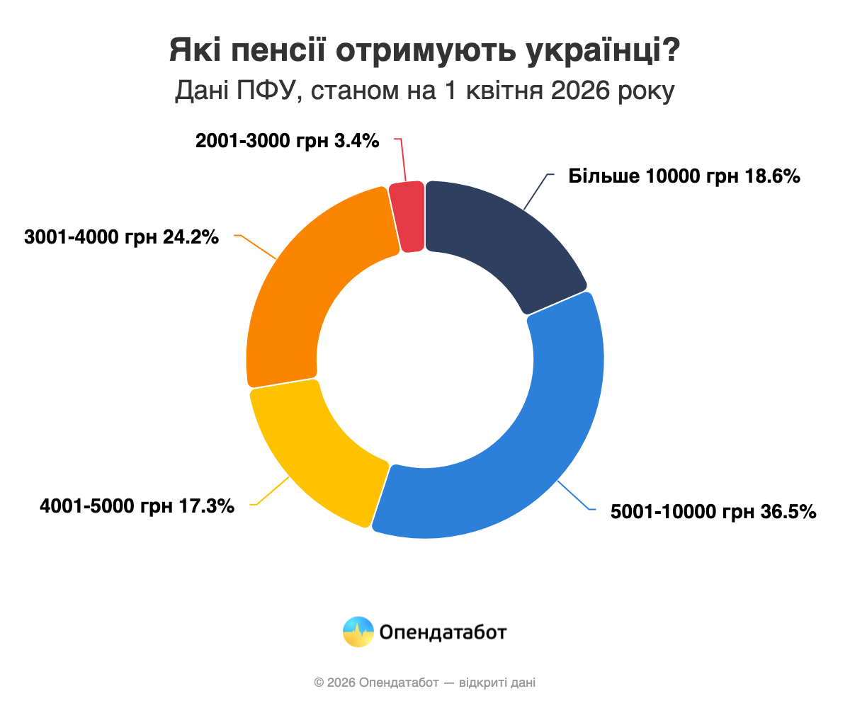 Водночас поступово зменшується частка пенсіонерів із виплатами від 4 до 5 тисяч гривень. Наразі це 1,74 мільйона людей, або 17%, тоді як рік тому їх було близько 20%. Середня пенсія тут — приблизно 4,5 тисячі гривень.
