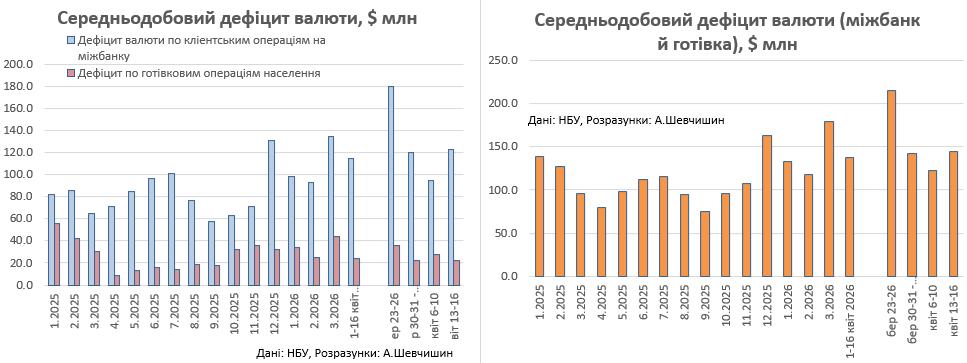 За тиждень, середньодобовий дефіцит валюти на міжбанку зріс на 28,9% з 95 М до 122,4 М дол. Якщо порівнювати середньодобові показники дефіциту безготівкового ринку за першу половину квітня з березнем, то тут на лице зниження більше ніж чверть.