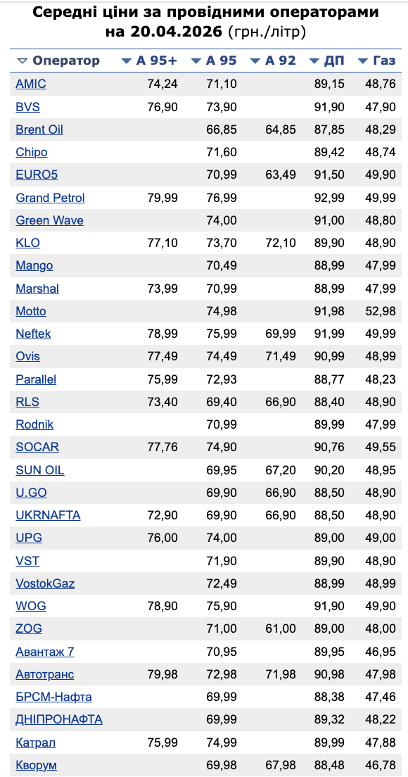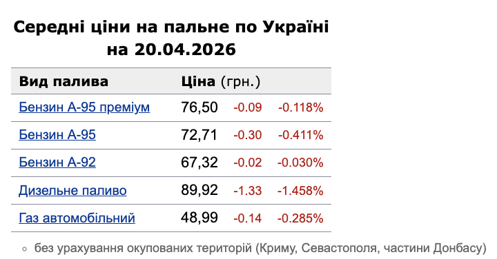 Ціни на пальне 20 квітня: дизель та бензин А-95 продовжують дешевшати