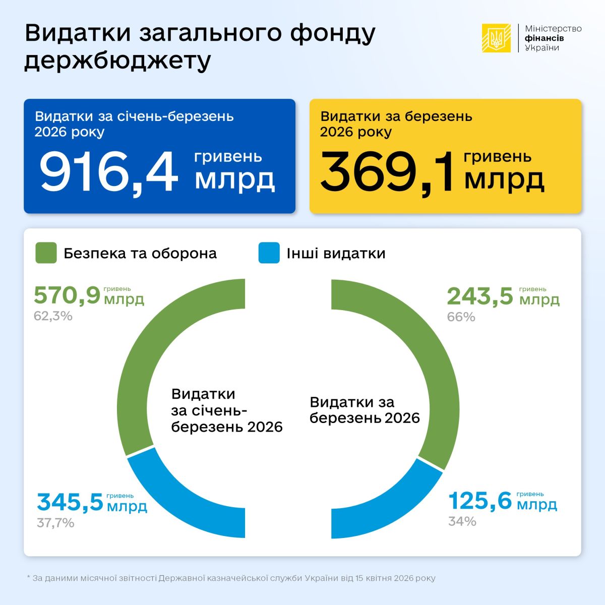 Видатки загального фонду державного бюджету на безпеку і оборону за січень — березень 2026 року становили 570,9 млрд грн, або 62,3% від усіх видатків загального фонду.