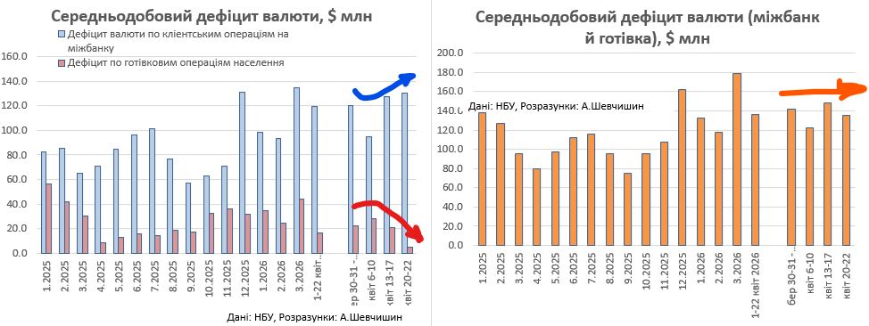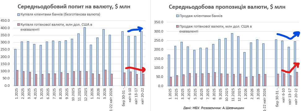 На готівковому ринку зафіксовано суттєве пожвавлення з боку продавців валюти. Середньодобовий продаж клієнтами зріс на 33,5% — із 57 млн до 76,3 млн доларів, що навіть дозволило сформувати профіцит у перший день тижня. Купівля готівки зросла лише на 4,4% (до 81 млн доларів). Відповідно, середньодобовий дефіцит готівкового ринку обвалився на 75,6% (із 20,8 млн до 5,1 млн доларів). Така масова здача валюти населенням пояснюється періодом сплати податків: фізичні особи-підприємці (ФОП) закривали зобов'язання за перший квартал до 20 квітня, а громадяни подавали річні декларації за 2025 рік.