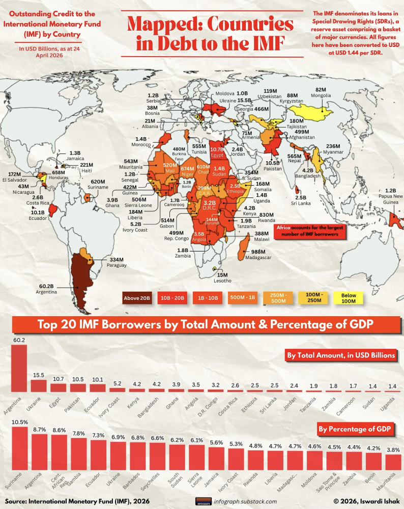 Африка вирізняється не розміром позик МВФ, а їх поширеністю. Континент має найбільшу кількість країн-позичальників, що відображає постійні структурні проблеми, які роблять зовнішнє фінансування постійною необхідністю.