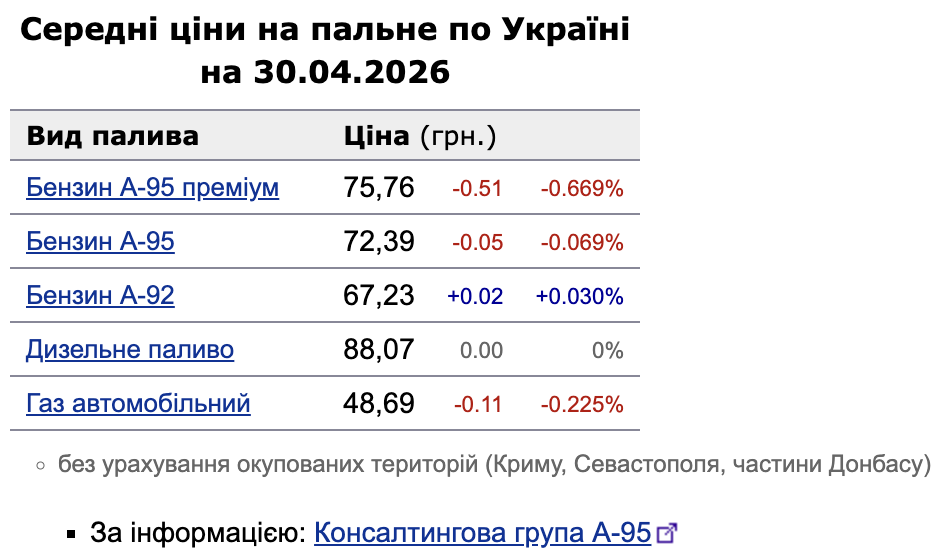 Ціни на пальне 30 квітня: бензин та автогаз дешевшають