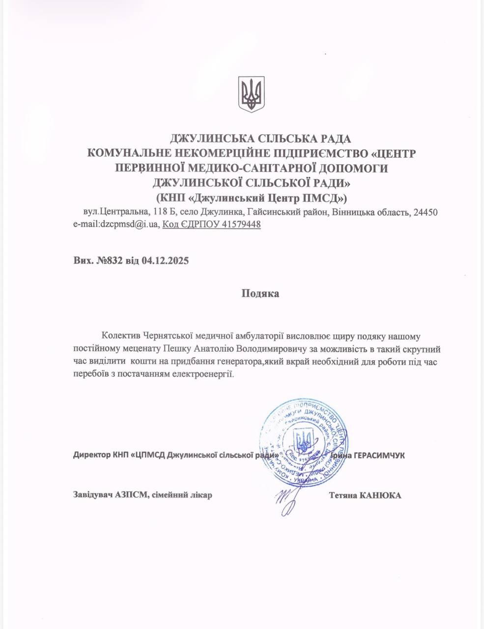 Sincere appreciation for the support and active civic position is expressed by Iryna Herasymchuk, Director of the Municipal Non-Profit Enterprise «Dzhulyn Primary Health Care Center» of the Dzhulyn Village Council, and Tetiana Kaniuka, Head of the Cherniatyn Family Medicine Outpatient Clinic.