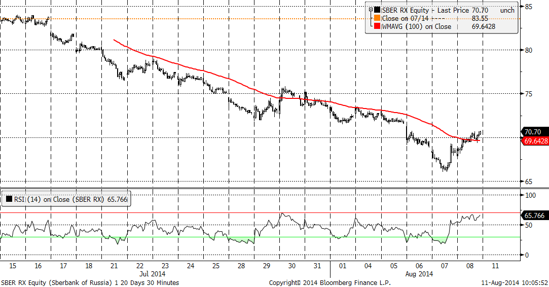 Рынок очень положительно воспринял новость о том, что российские банки не исключили из индекса MCSI. Акции Сбербанка уверенно закрепились выше скользящей средней. Путь наверх открыт, ближайшая цель – 75 рублей за акцию.