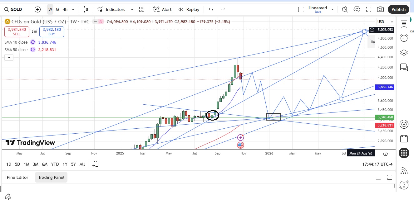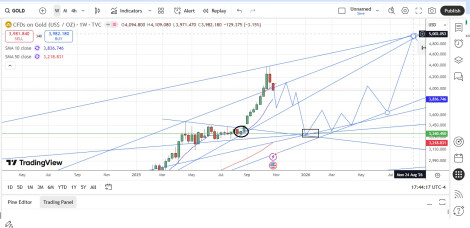 к этому моменту так же должна достичь своих целей. Далее, рабочая версия, что после какой-то консолидации будет рывок к 5000$ на фоне первого этапа паники на рынках. Интересно, какой свечой золото закроет месяц, хорошо бы еще снизиться на 100$ вниз для более медвежьей картины.