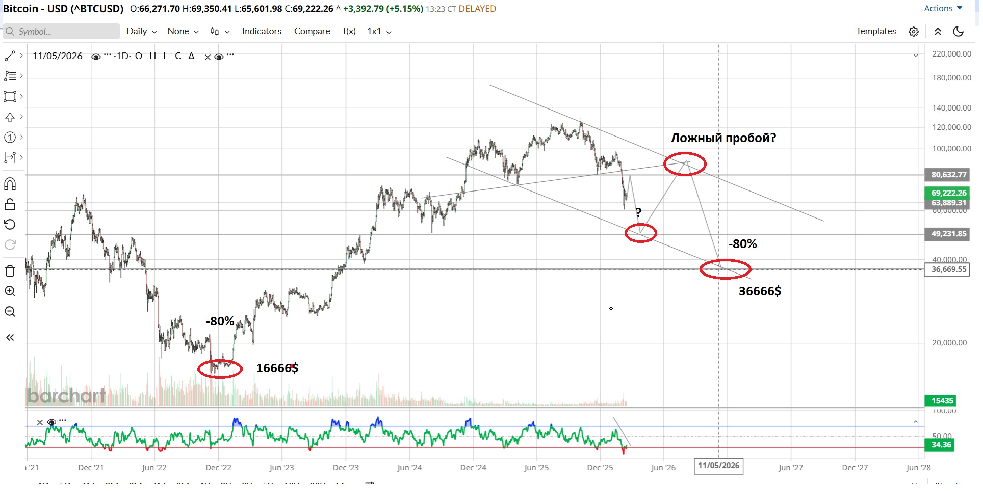 Нынешний подскок дожен быть продолжен, смысл тут снять перепроданность и разогнать цену вверх, внушить ложные надежны быкам и.т.д, после чего рисковые активы резко рухнут, тут прокол 49 тыс $ вероятно. Далее высокий отскок 90 тыс $ и выше, толпа верит в новую фазу роста. Во второй половине года новый обвал с притяжением к уровню 37 тыс ( стандартные -80% от прошлой волны роста).