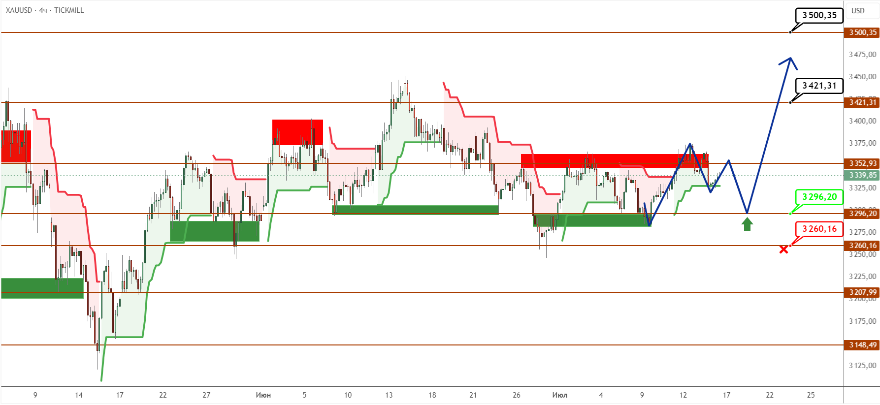Золото на прошедшей торговой неделе колебалось в рамках ограниченного диапазона, который пока не удается покинуть. Цена встретила поддержку на уровне 3296, от которого отскочила и начала расти в направлении уровня 3352, где столкнулась с сопротивлением, заставившим отступить обратно. Так или иначе, ожидаемый рост реализовался, поскольку котировки смогли отработать целевую область. Вместе с тем, ценовой график пробил красную зону супертренда и перешел в зеленую, что может указывать на активизацию усилий со стороны покупателей.