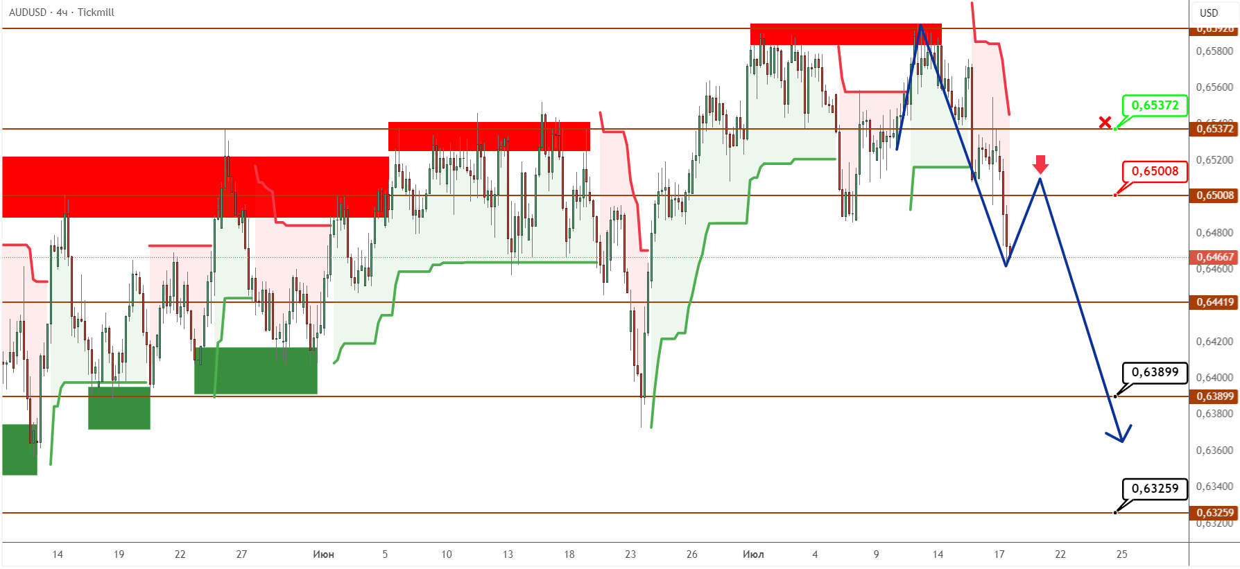 Австралийский доллар на прошедшей торговой неделе сформировал вторую вершину после того, как столкнулся с барьером, который не смог пробить, и после отскока от него начал быстро снижаться. Цена по ходу роста дошла до уровня 0,6592, где встретила ощутимое сопротивление, заставившее снова отбиться вниз, что вылилось в последующее снижение в направлении уровня 0,6441, попутно полностью преодолев сигнальную зону. Таким образом, сценарий с ростом так и не был реализован. К тому же, ценовой график пробился в красную зону супертренда, что указывает на активизацию со стороны продавцов.