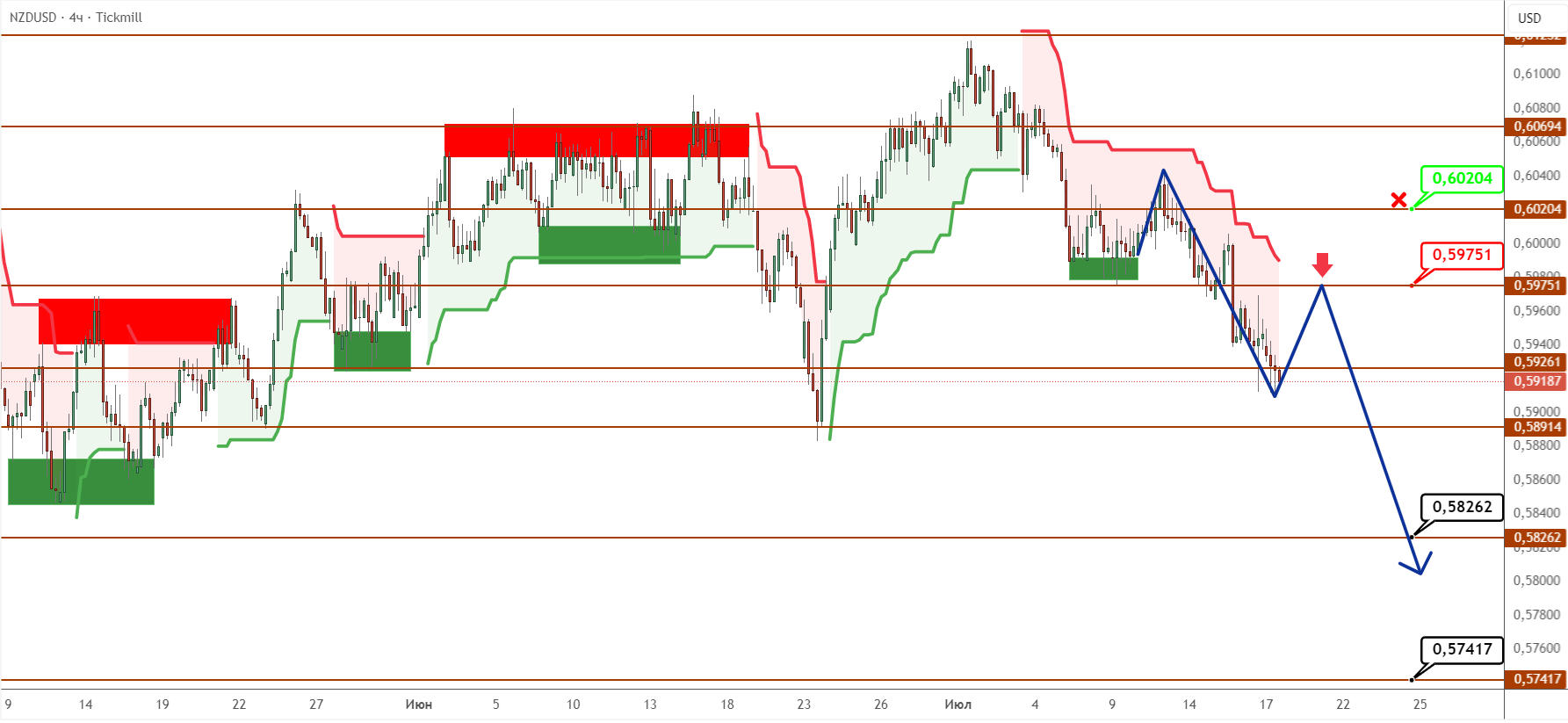 Новозеландский доллар на прошедшей торговой неделе продолжил двигаться вниз и вышел на очередные экстремумы. Цена подтвердила закрепление под уровнем 0,6020 после очередного ретеста и, совершив отскок, продолжила размеренно снижаться, дотянувшись до уровня 0,5926. Таким образом, сценарий с продолжением снижения был реализован с отработкой целевой области, согласно предполагаемому прогнозу. Помимо этого, ценовой график продолжает оставаться в красной зоне супертренда, свидетельствуя о доминировании продавцов.