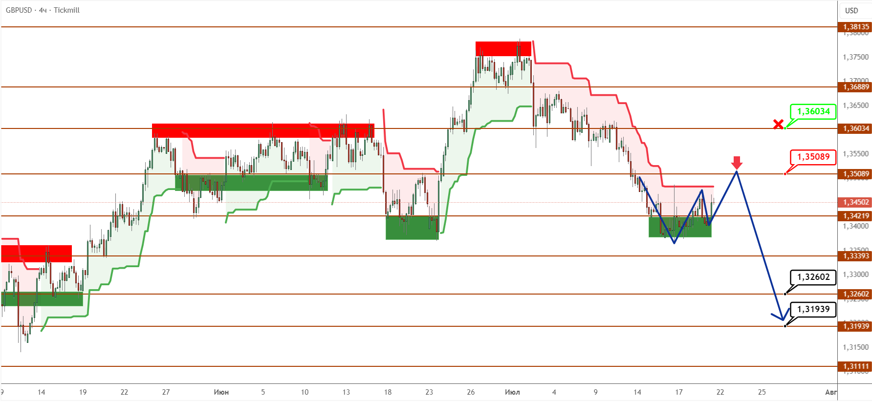 Отмена текущего сценария состоится в случае пробоя сопротивления и дальнейшего возврата цены выше разворотного уровня на 1,3603.