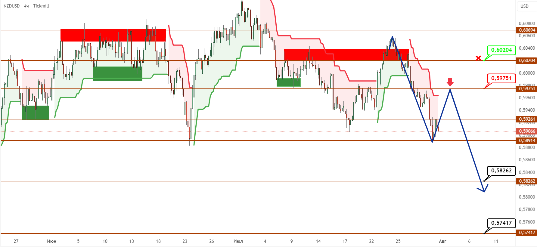 Сигнал на отмену текущего сценария будет получен в случае пробоя сопротивления и дальнейшего ухода цены выше разворотного уровня на 0,6020.