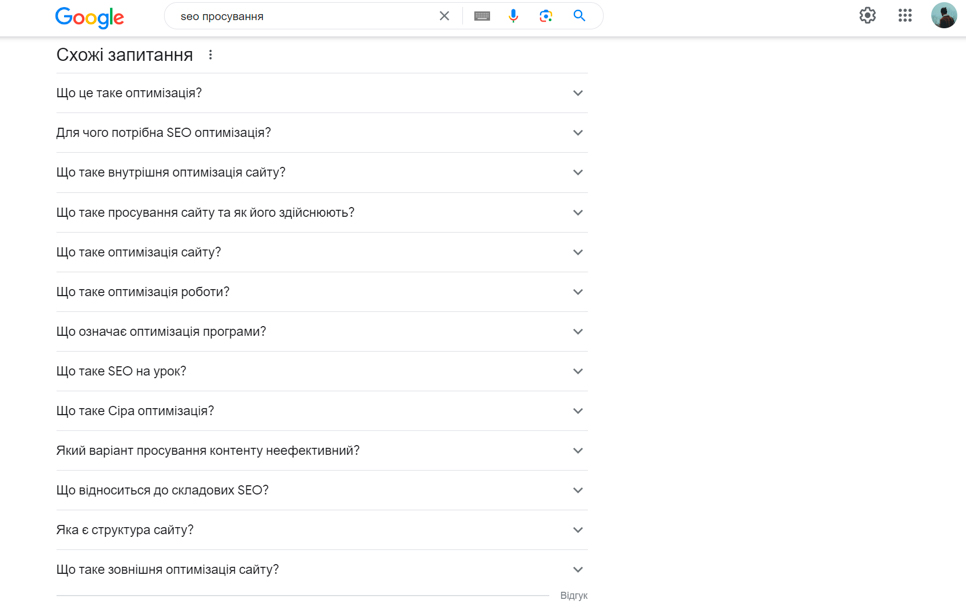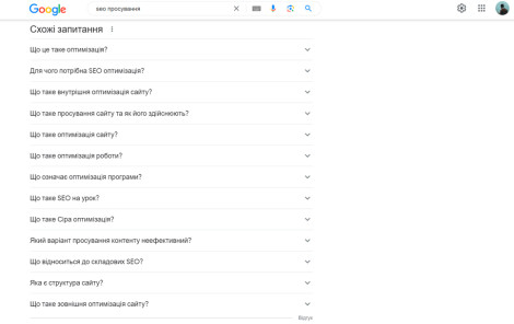 Коли користувач вводить певний пошуковий запит, система аналізує його й допомагає знаходити вміст, пов’язаний із цим запитом, а також надає швидкі відповіді на пов’язані запитання. У нашому випадку до запиту «SEO-просування» отримуємо наступний перелік «схожих запитань»: