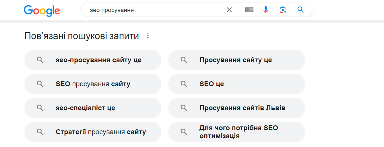Важливо!Коли ви використовуєте пов’язані пошукові запити, Google буде рекомендувати ваш сайт користувачам, які не застосовують повністю релевантний запит. Наприклад, ви розповідаєте, що таке SEO-оптимізація загалом і водночас залучаєте аудиторію, для якої актуальна ця послуга. І навпаки — просуваєте послуги SEO й водночас розповідаєте, що таке пошукова оптимізація.