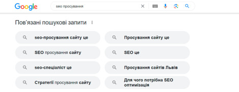 Як бачите, деякі з них не стовідсотково співвідносяться з нашою початковою фразою. Однак дають чітке розуміння того, які суміжні запити використовують наші потенційні клієнти. Наприклад, «стратегії просування сайту» чи «просування сайту Львів».