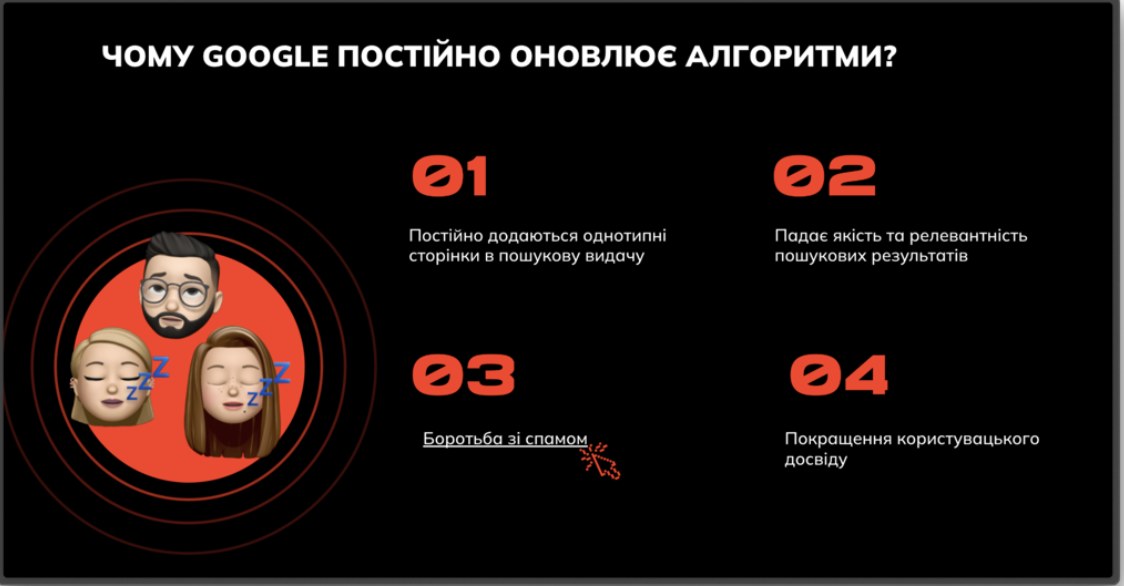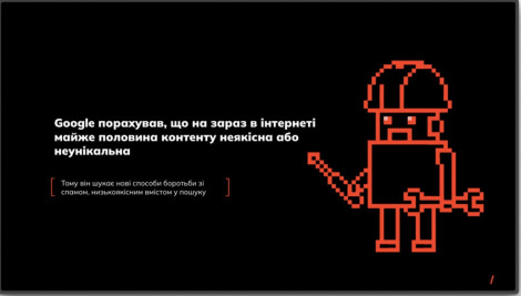 Боротьба з неякісним та неоригінальним контентом. Знижуються у рейтингу сторінки з низьким рівнем взаємодії з користувачами або ж ті, що створені переважно для пошукових систем, а не для людей.