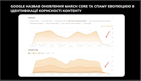 Ми виокремили групу «проблемних» сторінок і усунули переспам, зменшивши кількість деяких ключових запитів та повторів. Результат виявився позитивним — позиції 70% сторінок доволі швидко покращилися. Тому в першу чергу при їх просіданні ми рекомендуємо перевірити наявність спаму. Звичайно, це не гарантує повного вирішення проблеми. Але якщо позиції вашого сайту просіли саме після березневих оновлень, є висока ймовірність того, що причина саме у переспамі.