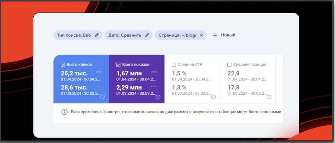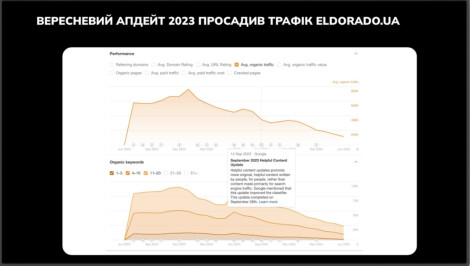 Тобто це ті аспекти, які зазвичай виходять за межі відповідальності нашої команди. Проте варто зазначити, що компанія теж відчула наслідки оновлень: приблизно 12% сторінок блогу Elit-Web втратили позиції, трафік зменшився на 12%, а кількість показів — на 27%. Ці цифри вказують на суттєвий вплив змін алгоритмів Google.
