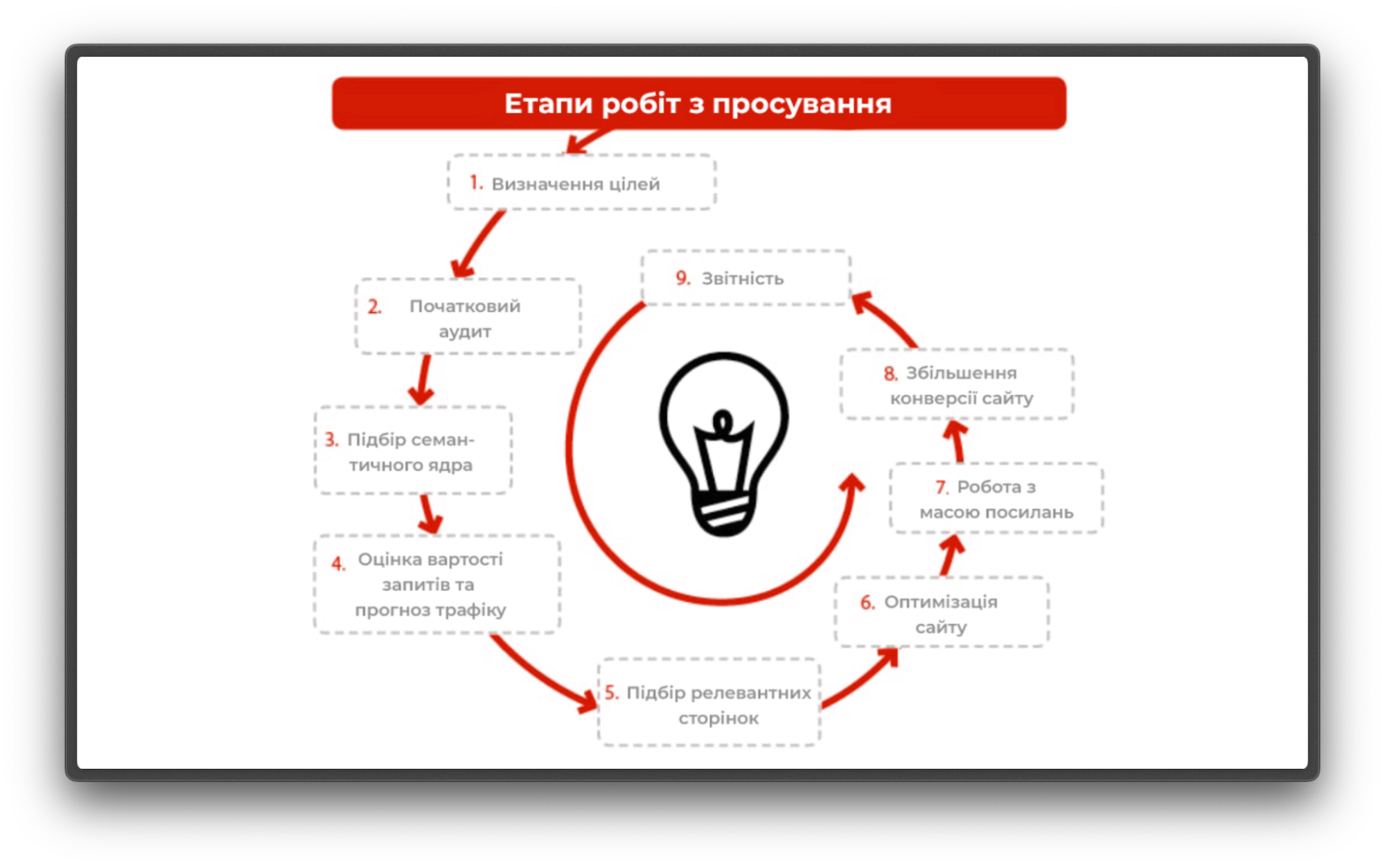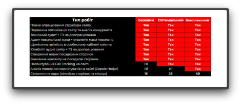 Що входить у перелік послуг пошукової оптимізації та чому ціни так сильно відрізняютьсяВарто розуміти, що пошукова оптимізація — це не одна послуга, а цілий комплекс дій, направлених на поліпшення позицій сайту у видачі Google (або інших пошукових систем). Комплексне SEO-просування може включати наступні дії: