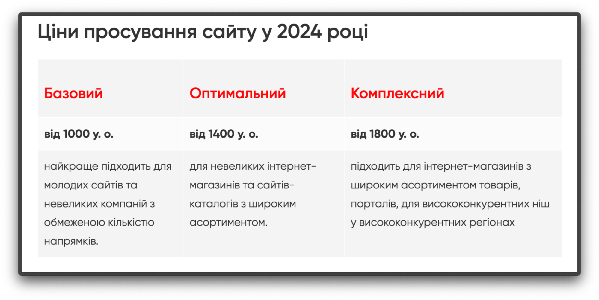 Яка мінімальна сума потрібна для SEO-просуванняОчевидно, що на початкових етапах роботи бізнесу чи стартапу не завжди можливо виділяти від $1500 лише на просування. Але зрештою це не обовʼязково — розпочати пошукову оптимізацію можна і з меншими бюджетами. Ми проаналізували поточну ситуацію на українському ринку і можемо назвати мінімальну суму, з якою можна починати роботи з SEO-оптимізації, — від $400 на місяць.