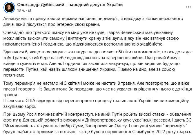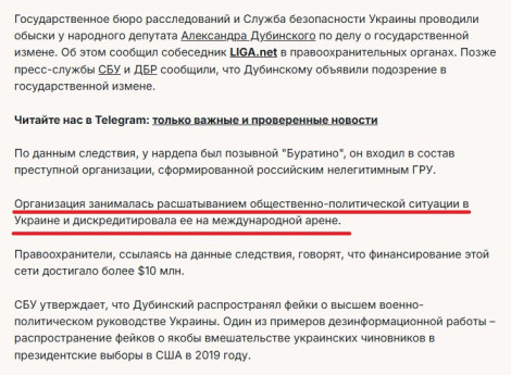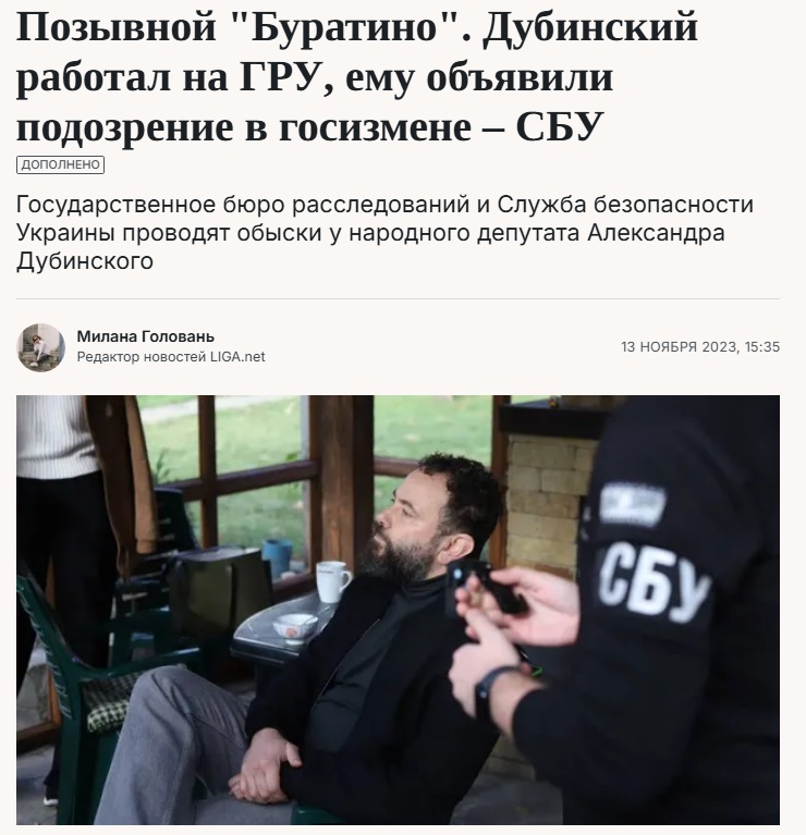 … В середине ноября 2023 года был арестован по делу о госизмене. По данным СБУ, по крайней мере с 2019 года Дубинский под позывным «Буратино» работал в агентурной сети ГРУ, осуществлявшей «информационно-подрывную деятельность в пользу России». В задачи сети, по версии СБУ, входили «расшатывание общественно-политической ситуации в Украине и дискредитация страны на международной арене»..