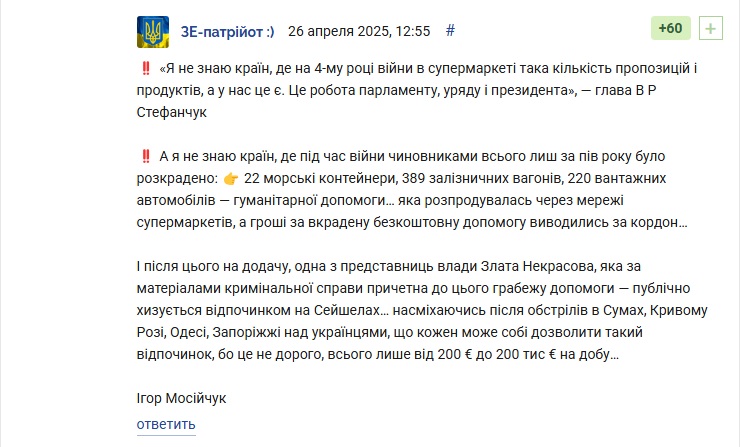 … 28 березня Центр протидії дезінформації спільно з Кібердепартаментом СБУ виявили мережу поширення ворожої дезінформації в соцмережі «ТікТок» та оприлюднили для громадськості перелік шкідливих каналів, серед яких був канал Мосійчука. Після російського ракетного обстрілу 8 липня Мосійчук поширював недостовірну інформацію про ураження військових об'єктів та загибель військових у Василькові. 11 липня 2024 року Мосійчук виступив проти заборони Московського патріархату на території України....