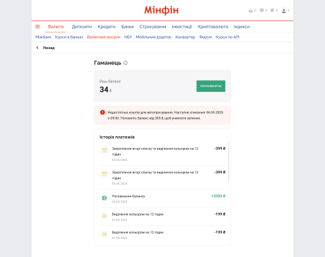 4. Якщо баланс менший за вартість продовження, система повідомить про необхідність поповнення.