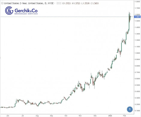 Доходность облигаций продолжает повсеместно прибавлять, отыгрывая ожидания повышения процентных ставок. Доходность двухлетних облигаций США закрепилась выше отметки 1,50% и находится на пиках года.