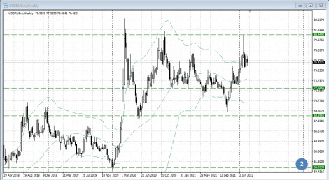 Российский рубль к доллару США укрепляется ниже 77. Свою роль тут сыграли геополитика и ожидания последующих повышений процентных ставок со стороны Центробанка РФ (рис.1). Глобально острая реакция заканчивается тестированием 80.44 (рис.2).
