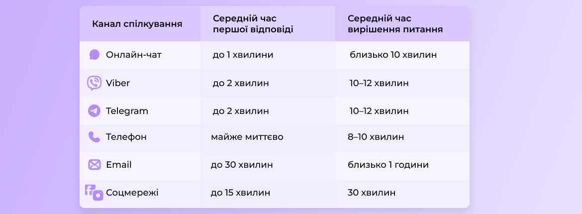 Так, 24/7 у чаті та месенджерах. Орієнтир: чат — до 1 хв, месенджери — до 3 хв, соцмережі — до 15 хв, телефон — майже миттєво.