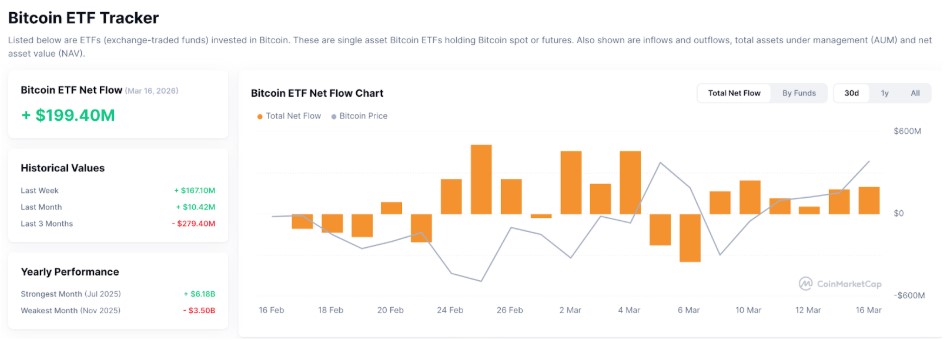 На графіку CoinMarketCap це теж добре видно: після слабшої другої половини лютого денні потоки знову перейшли в плюс, а лише 16 березня чистий приплив становив $199,4 млн.