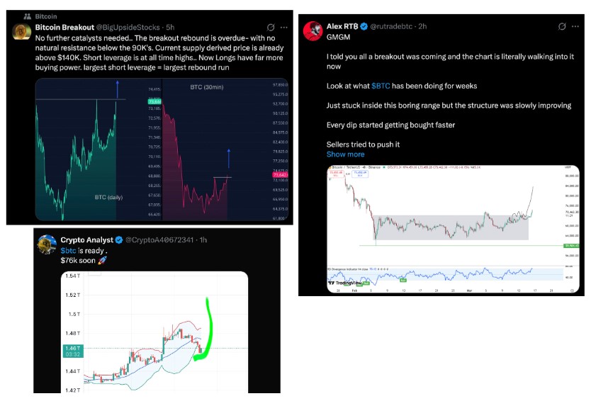 Останніми ж днями частина технічних аналітиків уже говорить не просто про відскок, а про рух, який починає набирати власної інерції. У таких фазах зростання зазвичай підтримується одразу кількома чинниками: закриттям коротких позицій, підключенням нових покупців, які не встигли зайти раніше, а також відсутністю сильного опору безпосередньо над поточними рівнями. У результаті кожен новий рух угору посилює наступний, що дає біткоїну додаткове прискорення після первинного відновлення та може допомогти ринку закріпитися вище $74 000. А те, що 16 березня біткоїн протестував рівень $76 000, надає ринку ще більше переконливих ознак зміцнення.