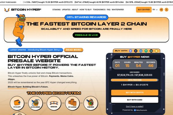 Bitcoin Hyper ($HYPER) — токен першого Layer 2 рішення для Bitcoin, побудованого на віртуальній машині Solana (SVM). Проект прискорює транзакції Bitcoin до 10 000 в секунду і знижує комісії до $0,01, підтримуючи DeFi, стейкінг і мемкоїни. Пресейл, що розпочався в 2025 році, зібрав $7,4 млн, вартість — $0,01255 за токен.