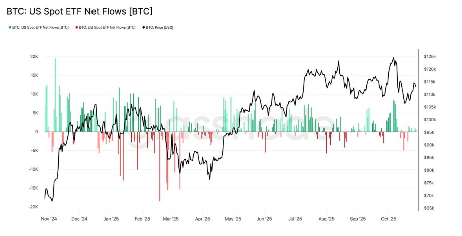 Джерело: Glassnode. Чисті потоки спотових BTC-ETF у жовтні 2025 року: припливи на початку місяця змінилися відтоками в середині, що збіглося з корекцією ринку.