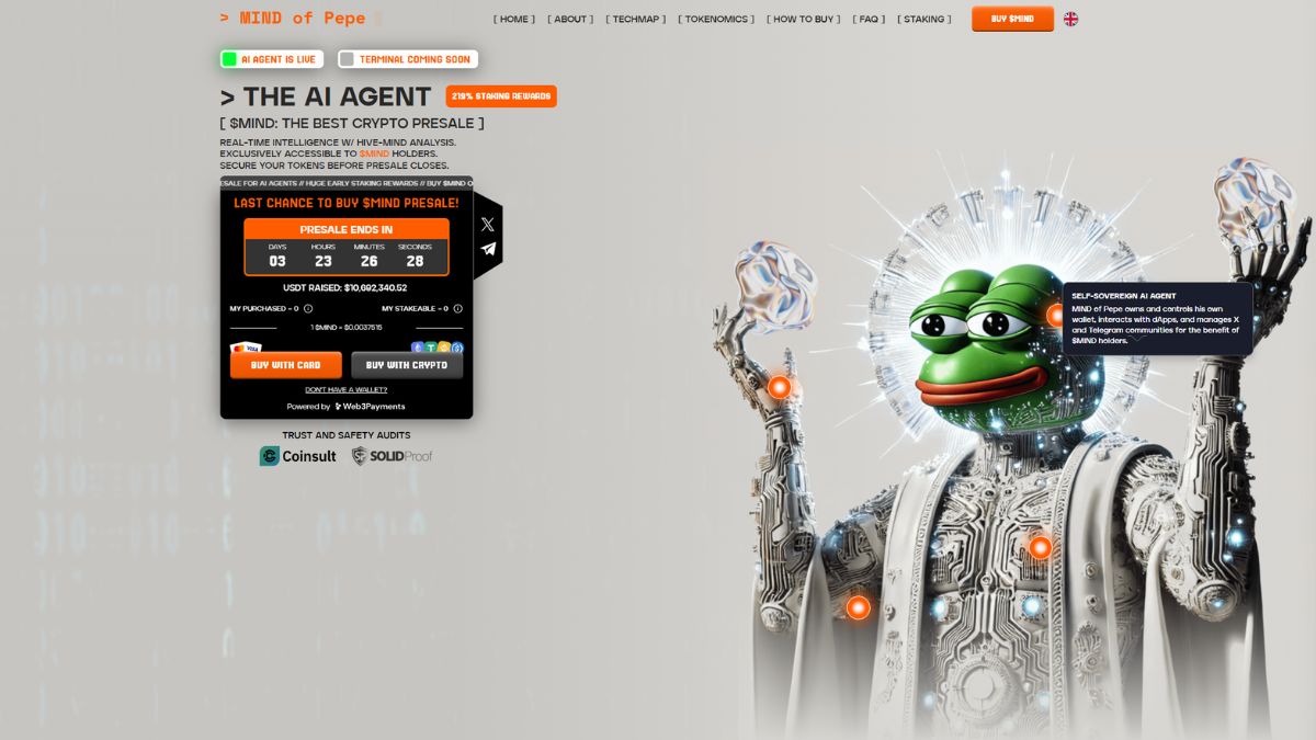 Зараз вартість $MIND становить $0,0037515. На тлі попиту на AI в криптовалюті, аналітики не виключають, що токен MIND of Pepe може зрости в ціні на 300% до кінця року.