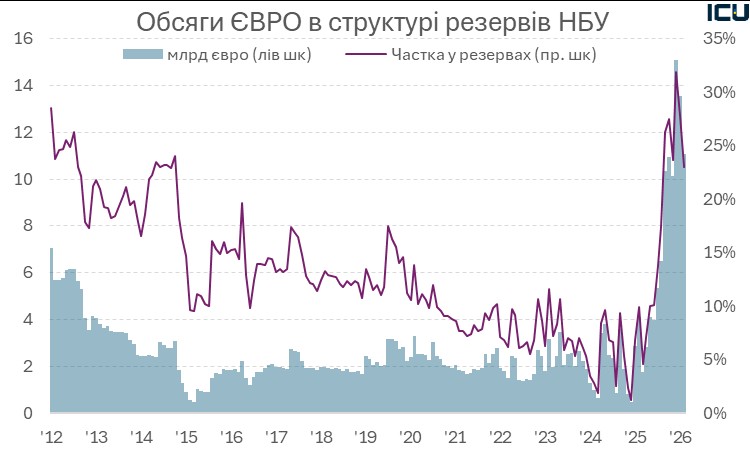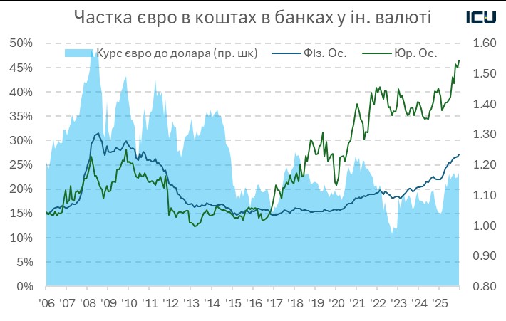 Так, український бізнес на початок 2026 року 46% своїх валютних коштів у банках України тримав у євро. Тут теж можна розгледіти вплив геополітики. Так, частка євро була найнижчою у 2011−2016 роках й поступово зростала в міру більшої інтеграції країни у європейську економіку.