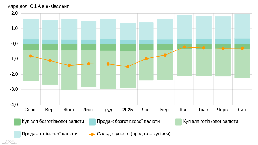 І це при тому, що ще в січні 2025 року сальдо таких операцій було в межах $1,48 млрд (сума купівлі валюти населенням перевищувала на цю суму обсяг здачі валюти громадянами), а в лютому ще становила $958 млн.