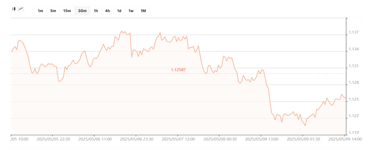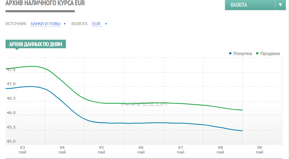 Євро за цей же період на українському міжбанку подешевшав слідом за подіями на світових ринках на 38 копійок — зі стартових рівнів понеділка, 5 травня, 47,1244/47,1686 до 46,7669/46,7840 гривень до завершення п'ятничної сесії 9 травня. Курс продажу готівкового євро в обмінниках фінкомпаній цього ж дня ввечері перебував у межах 47,20 — 47,40 гривень.