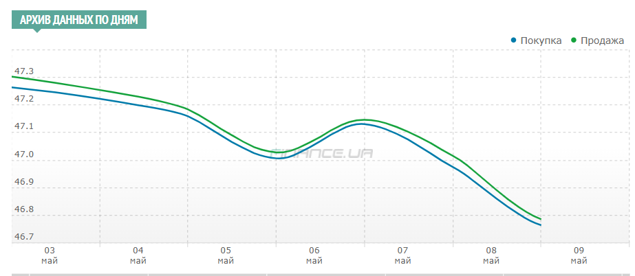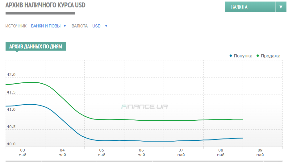 У результаті за період із 5 до 9 травня курс продажу долара на українському міжбанку просів на 9 копійок — із 41,60/41,65 до 41,53/ 41,56 гривень, готівковий долар у п'ятницю ввечері, 9 травня, обмінники фінкомпаній продавали без жодних проблем за 41,70 грн.