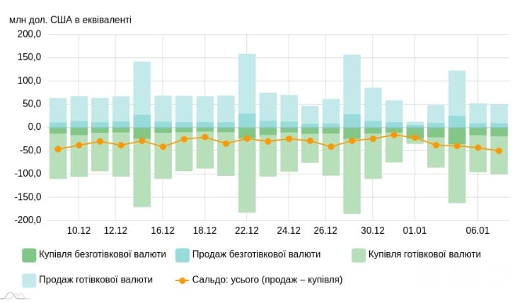 За моїм прогнозом, перевищення купівлі валюти громадянами над обсягами її здачі в обмінники та каси банків, а також продажів з карток буде в період з 12 по 16 січня в межах щоденних обсягів від $30 млн до $65 млн. Це буде «тиснути» на курс у готівковому сегменті.