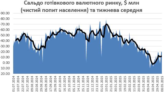 На міжбанку перший повний тиждень травня минув із суттєвим зростанням пропозиції валюти та зниженням попиту. Сальдо валютних операцій знизилось на понад третину — до 70 М дол.